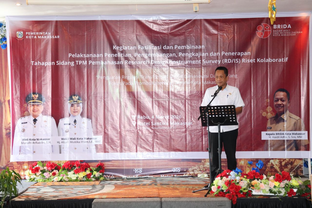 Kepala Badan Riset dan Inovasi Daerah Kota Makassar, Haidil Adha, S.Sos., M.M., menghadiri Rapat Pembahasan Research Design/Instrument Survey (RD/IS) pada Kelompok Riset Tematik Penguatan Regulasi Transformasi Digital dan Inovasi Daerah yang berfokus pada Promosi Kesehatan Mental Kota Makassar Tahun Anggaran 2026. Rapat ini membahas penyusunan desain penelitian dan instrumen survei sebagai dasar pelaksanaan riset yang mendukung penguatan kebijakan transformasi digital serta inovasi daerah dalam upaya peningkatan promosi dan layanan kesehatan mental masyarakat Kota Makassar. π Tanggal: 4 Maret 2026 π Waktu: 13.30 WITA π Lokasi: Hotel Santika Makassar #BRIDAMakassar #RisetKesehatanMental #TransformasiDigital #InovasiDaerah #RisetDaerah #MakassarMULIA #MunafriArifuddin